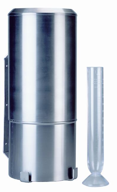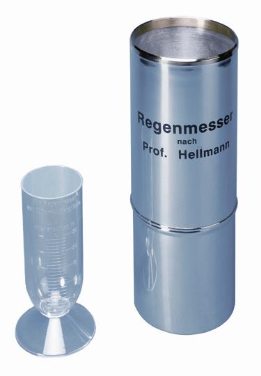 - Avec le pluvimètre de type Hellmann pour pluie et neige, la précipitation captée par l'entonnoir est récoltée dans le récipient collecteur situé dans la partie basse du pluviomètre. La capacité est vérifiée en litres à l’aide de l’éprouvette dont la graduation permet de lire la hauteur de précipitation au dixième de mm. Ce pluviomètre possède en plus deux croix de neige et un couvercle.